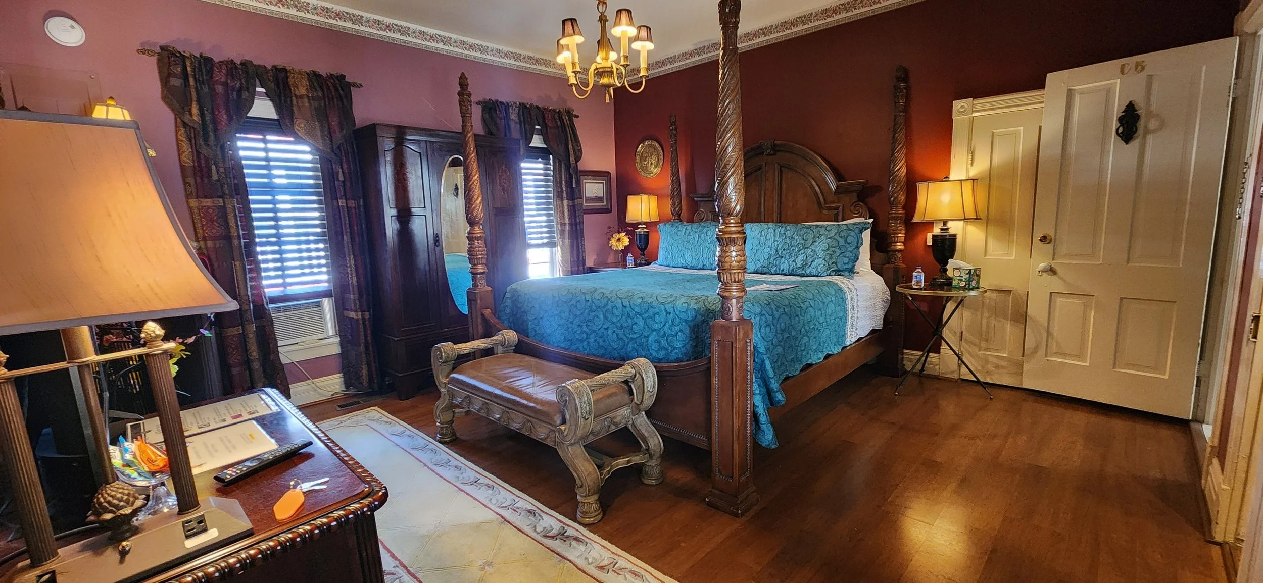 The Staffordshire Suite is located on the street level, and is directly inside the front door. This sunny suite offers you lovely garden views from the large windows, and gives you perfect access to the front porch, where you can relax on our rocking chairs. The Staffordshire Suite is furnished with a four poster queen sized bed, mini-fridge, microwave, drip coffee pot, electric fireplace, and a bath/shower combination.